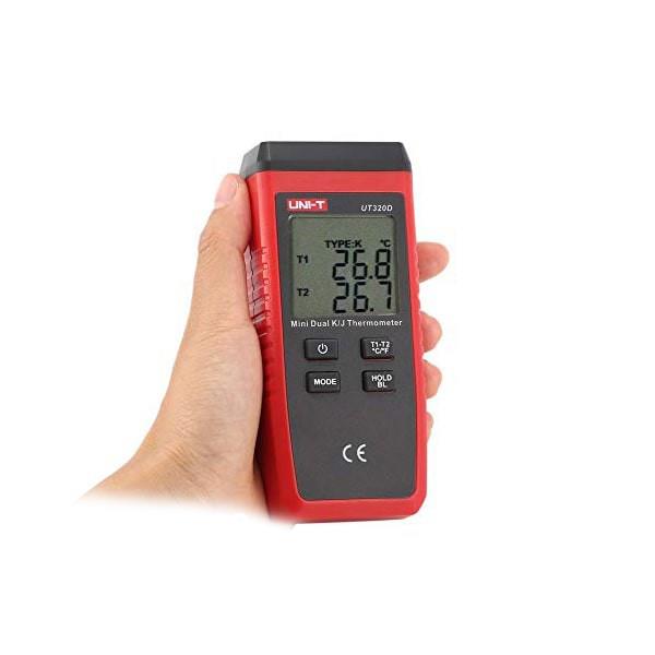 ترمومتر(حرارت سنج) تماسی یونیتی مدلUNI-T UT-320D ، ترمومتر دو کاناله دیجیتال مولتی ترموکوبل دما را از -50 تا 1300 درجه سانتی گراد اندازه گیری می کند، از جمله استفاده های این دستگاه کاربرد آزمایشگاهی آن می باشد. دستگاه حرارت سنج مدل UT-320D با نرخ نمونه برداری 4 بار در ثانیه و دارا بودن حالت های ماکسیمم/مینیمم/میانگین حرارت سنج تماسی کوچک و قابل حمل است که میتوان برای کار با آن از پراب های نوع K یا J استفاده کرد. این نوع دارای اندازه گیری اختلاف دما نیز می باشد.
