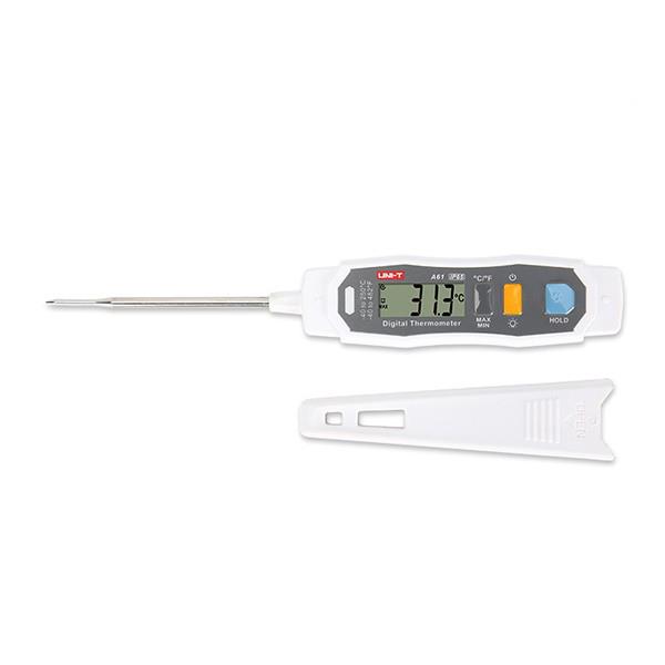 ترمومتر نفوذی دیجیتال یونیتی UNI-T A61 از سری دماسنج های پرتابل برند یونیتی با پراب استیل ضد زنگ FDA، پوسته محافظ و درجه حفاظتی IP65 که از مقاومت بسیار بالایی برخوردار است.